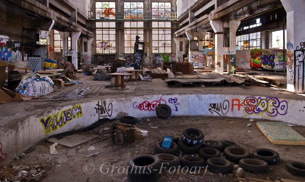 Fotosession in der Halle. Schrillst: Eine ehemalige Montagegrube für Schiffsschrauben. Heute ein Reifengrab und Matrazenlager. "Action-Trashing" als Event für gelangweilte Kids.